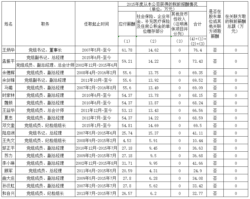 備注:上表披露信息為我公司企業(yè)負責人2015年度全部應發(fā)稅前薪酬,按國家規(guī)定由單位繳存各種社會保險等。其中,第(1)項由國務院國資委核定。