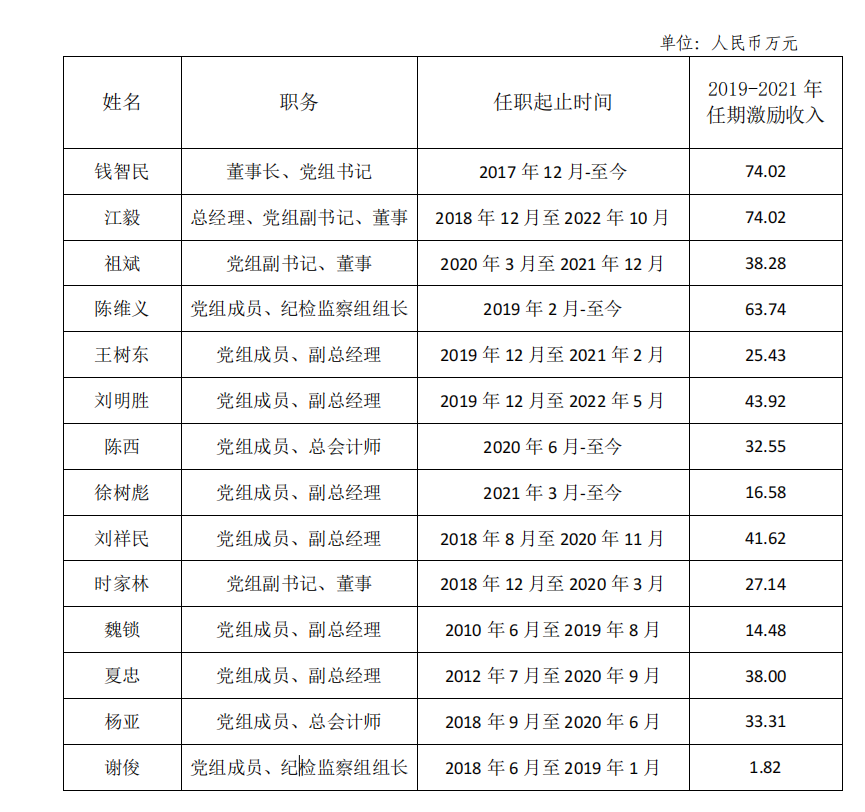 國家電力投資集團公司企業(yè)負(fù)責(zé)人2019-2021年任期薪酬情況