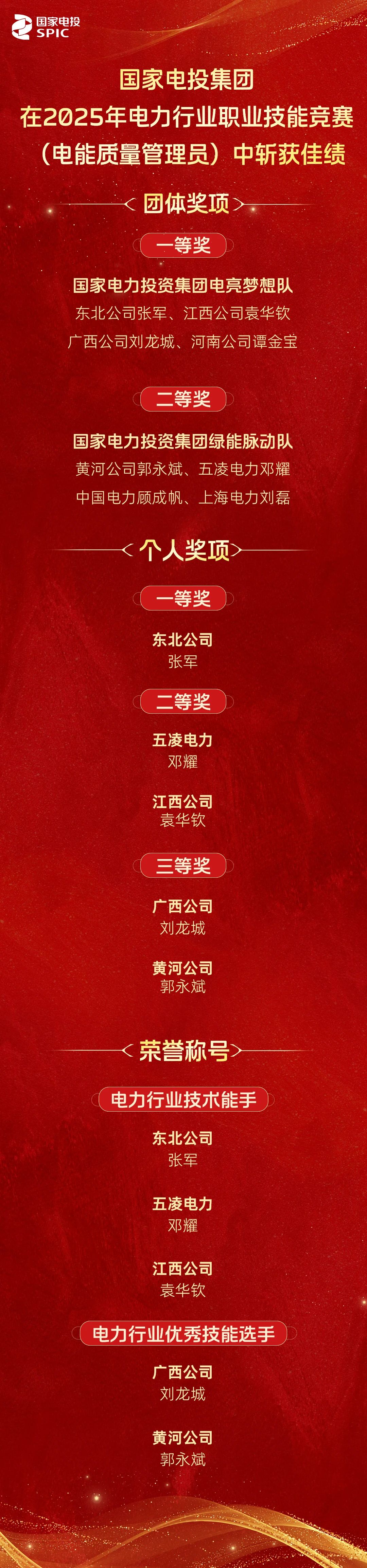 近日,2025年電力行業(yè)職業(yè)技能競賽(電能質(zhì)量管理員)在山東臨沂收官。國家電投集團2支代表隊、8名選手在此次競賽中表現(xiàn)卓越,喜獲佳績。國家電投集團電亮夢想隊獲團體一等獎(發(fā)電組中唯一獲此殊榮),國家電投集團綠能脈動隊獲團體二等獎,國家電投集團東北公司張軍獲個人一等獎(發(fā)電組中唯一獲此殊榮)并被中電聯(lián)授予“電力行業(yè)技術(shù)能手”榮譽稱號,五凌電力鄧耀、江西公司袁華欽獲個人二等獎并被中電聯(lián)授予“電力行業(yè)技術(shù)能手”稱號,廣西公司劉龍城、黃河公司郭永斌獲個人三等獎并被中電聯(lián)授予“電力行業(yè)優(yōu)秀技能選手”稱號。