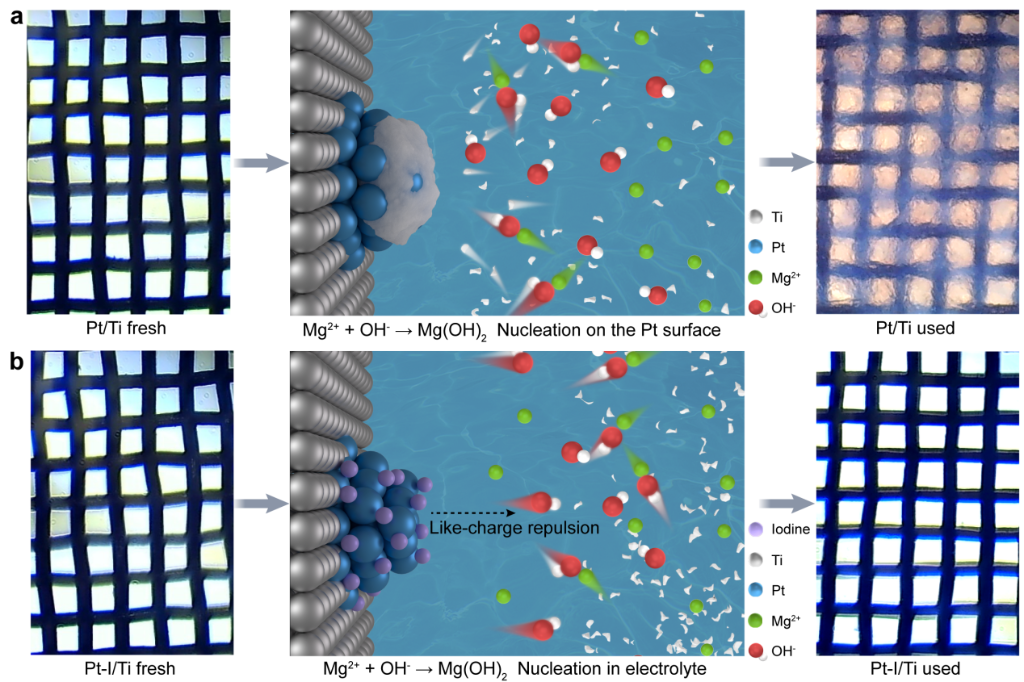 當(dāng)前,電解淡水制氫成本高、資源消耗大。海水是理想的制氫原料,但其中富含的鎂離子在電解過程中易在電極表面沉積,導(dǎo)致電極快速失效。