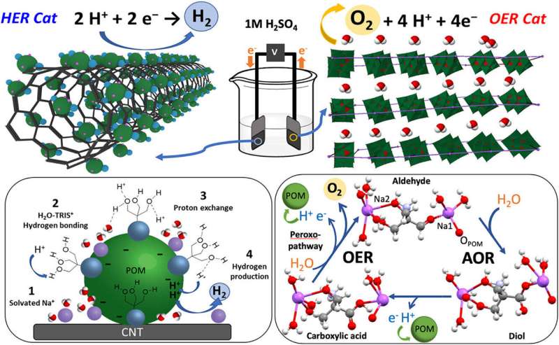 研究團(tuán)隊(duì)將一種釩簇與碳納米管結(jié)合,形成混合材料。團(tuán)隊(duì)負(fù)責(zé)人瑪麗亞·希門(mén)尼斯-洛佩茲指出:“關(guān)鍵不在于金屬簇本身,而在于其周?chē)袡C(jī)陽(yáng)離子的排列方式。” 當(dāng)材料與納米管物理混合時(shí),被稱(chēng)為T(mén)RIS的陽(yáng)離子被鎖定在晶體結(jié)構(gòu)中,促使反應(yīng)通過(guò)特定氧化機(jī)制產(chǎn)生氧氣。而當(dāng)材料以定向方式組裝時(shí),同樣的陽(yáng)離子被釋放并朝向表面,起到捕獲質(zhì)子的作用,從而使系統(tǒng)轉(zhuǎn)變?yōu)楦咝У漠a(chǎn)氫催化劑。